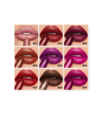 #01 – Rose nude, #02 – Cramoisi classiqu, #03 – Prune profond, #04 – Brun moka, #05 – Violet électrique, #06 – Fuchsia éclatant, #07 – Rouge rubis, #08 – Noir expresso, #09 – Baie magenta